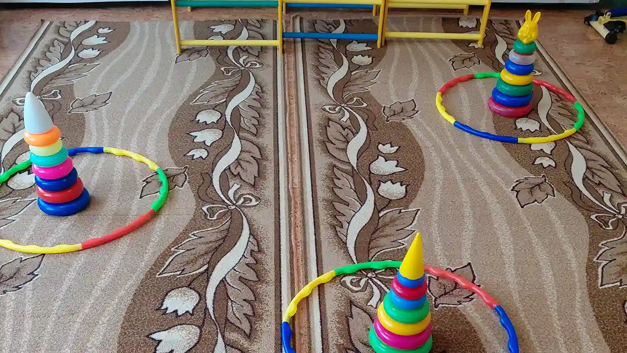 По сигналу: «Раз, два, три кольца правильно сложи», дети должны в правильной последовательности собрать пирамидки.